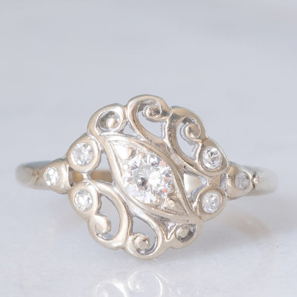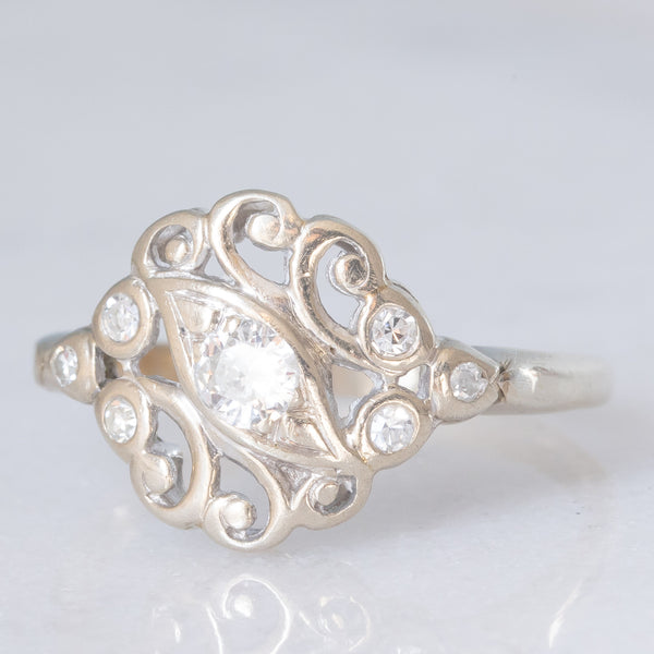 Anello vintage in oro bianco 14K con diamanti di taglio brillante (0.34ctw ca.) e con decorazioni a traforo, anni ‘70/‘80