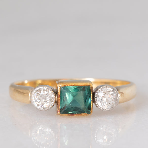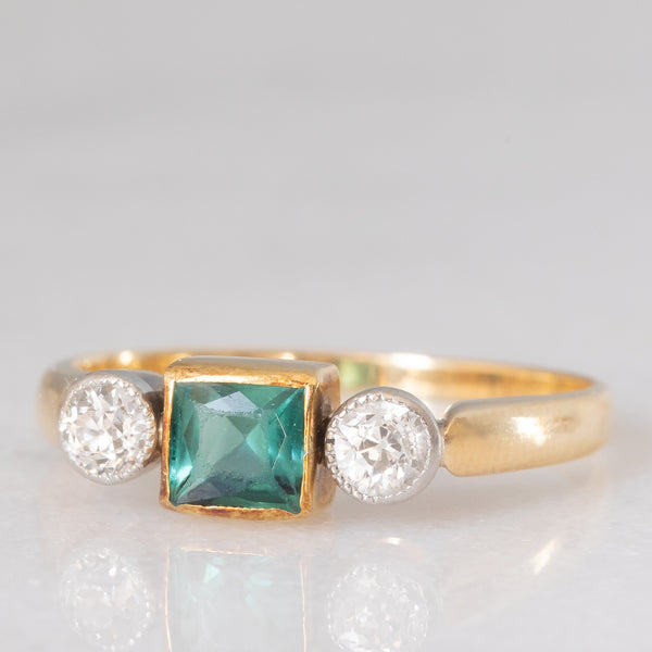 Trilogy antico in oro giallo 14K con tormalina verde di taglio carré (0.35ct ca.) e diamanti di taglio vecchia Europa (0.30ctw ca.), anni ‘20/‘30