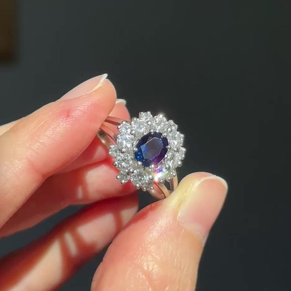 Anello vintage a margherita in oro bianco 18k con zaffiro (1,30ct) e diamanti (1,30ctw), anni '70