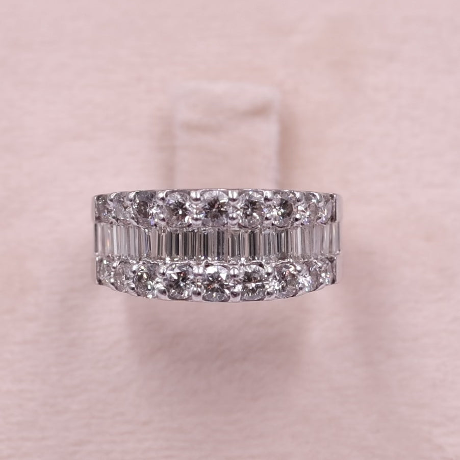Trattandosi di un’illusione l’anello è quindi in realtà un pezzo unico, una elegantissima fascia comunque composta da tre elementi, con i due esterni tra di loro uguali e con il centrale diverso: i primi due sono decorati da una fila di diamanti di taglio brillante, mentre quello centrale da diamanti di taglio baguette. Insieme i diamanti arrivano a un totale di ben 2ct!