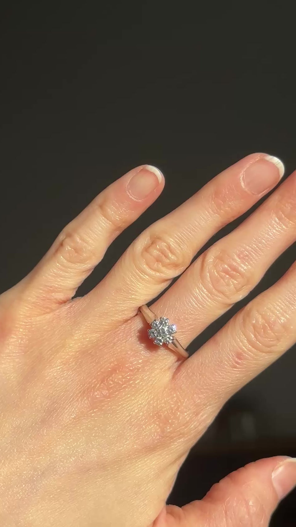 Lo caratterizza una forma a margherita, in questo caso declinata in una delle varianti più amate, essendo completamente decorato da diamanti; diamanti luminosi e straordinari, che catturano lo sguardo immediatamente: come vuole la regola, al centro troviamo la pietra più grande, circondato da un giro di altre più piccole; i diamanti sono tutti di taglio brillante, e sono per un totale stimato di 0.45ct ca.