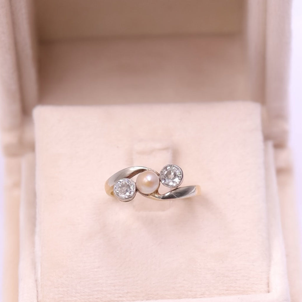 Anello antico trilogy in oro giallo 18k con perla e diamanti (0,70ctw), primi del '900