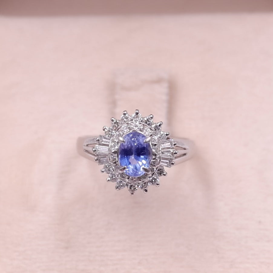 Platino 850, zaffiro di taglio ovale di 1,10ct e diamanti di taglio brillante e tapered per un totale di 0,63ct