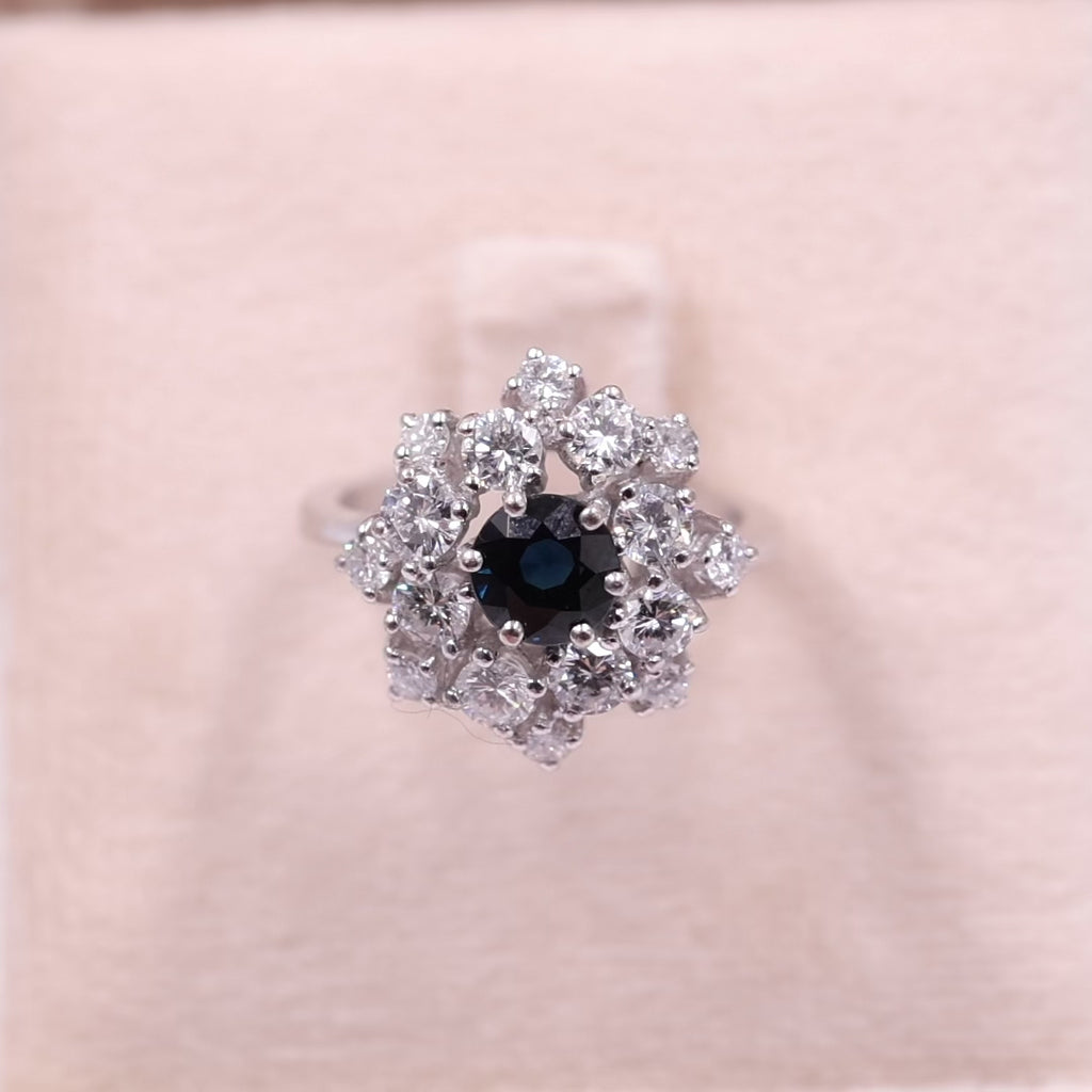 Anello vintage a margherita in oro bianco 14k con zaffiro (1ct) e diamanti (1,60ctw), anni '70