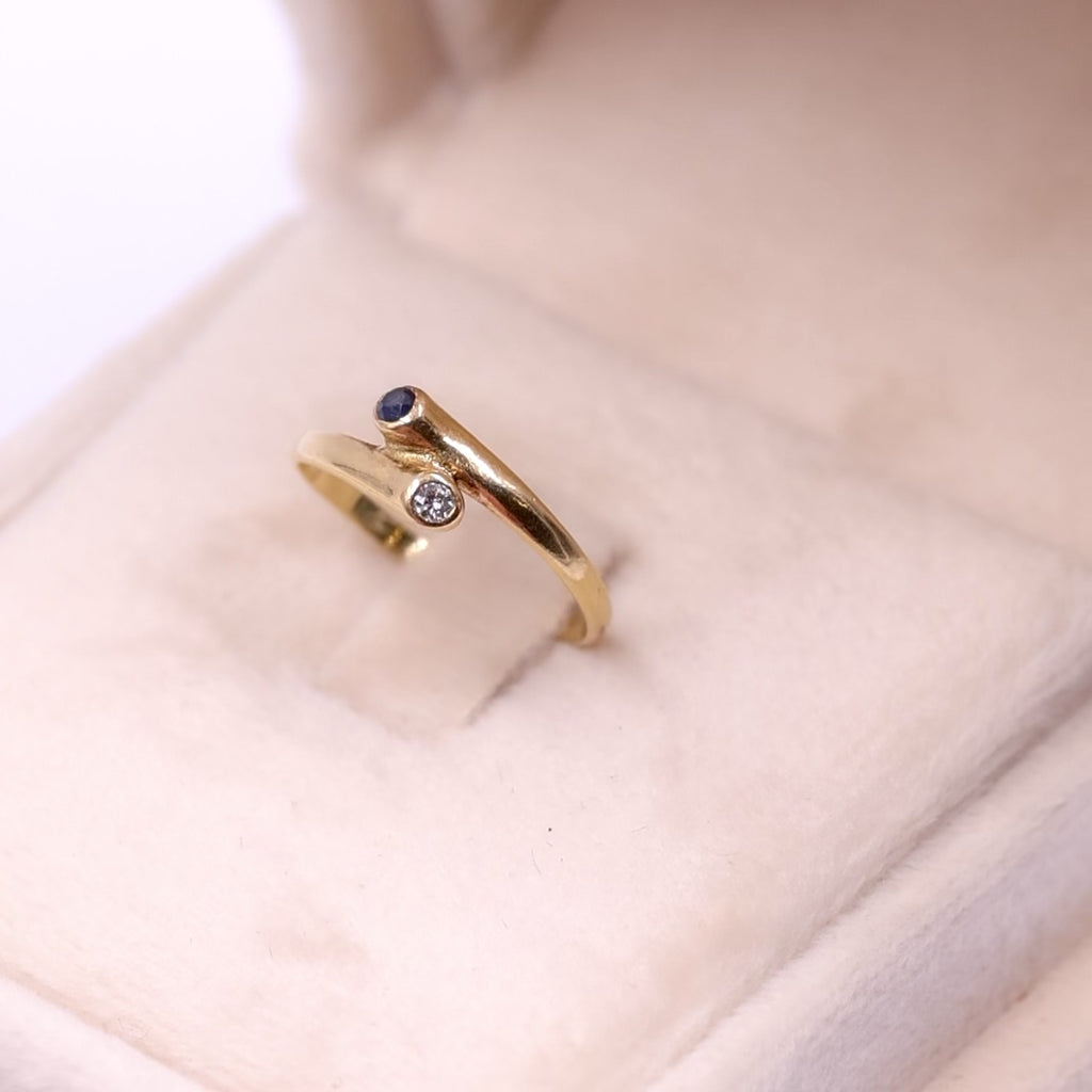 Anello contrarier in oro giallo 18k con diamante e zaffiro, anni '70