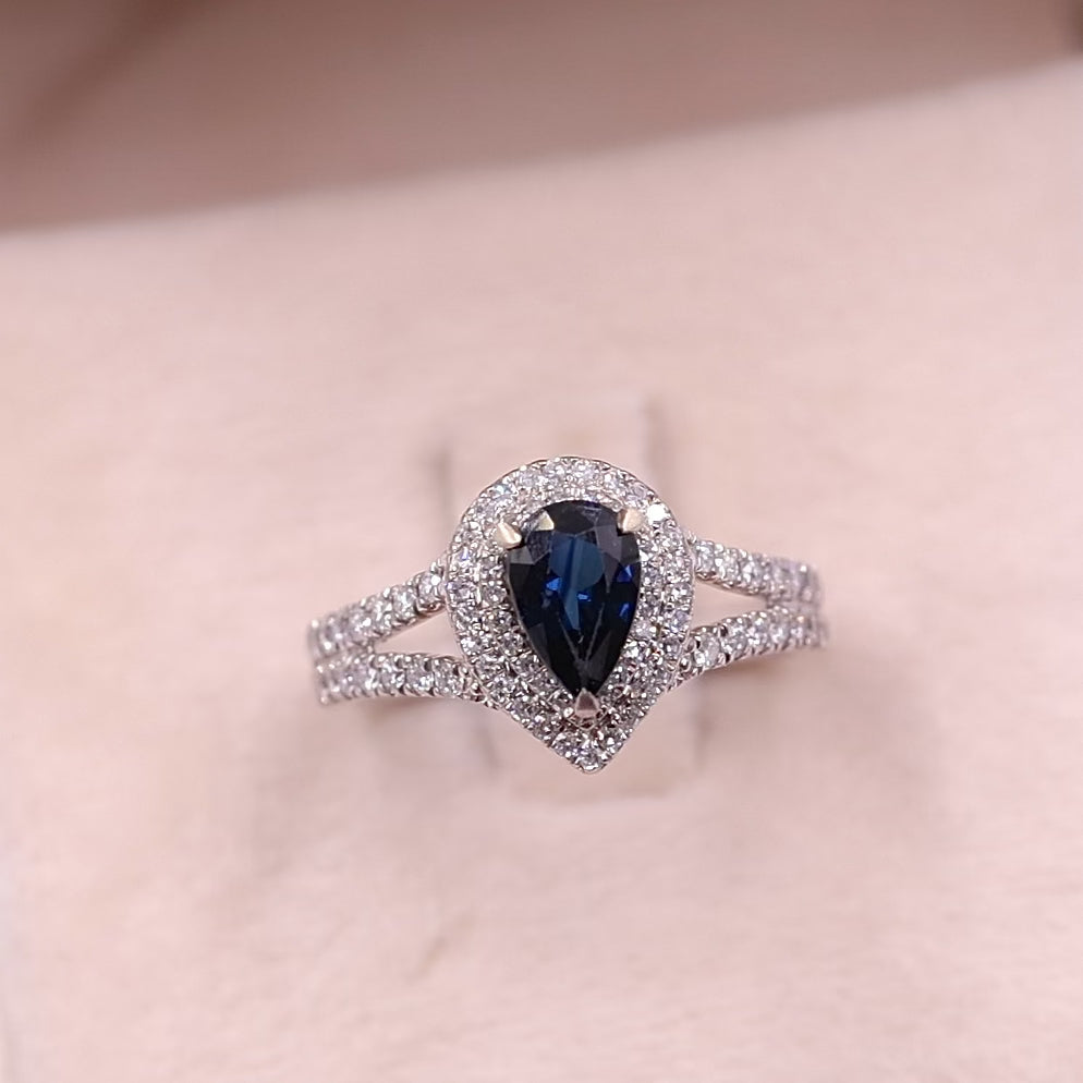 Anello vintage in oro bianco 18k con zaffiro a goccia (1ct) e diamanti (0,70ctw)