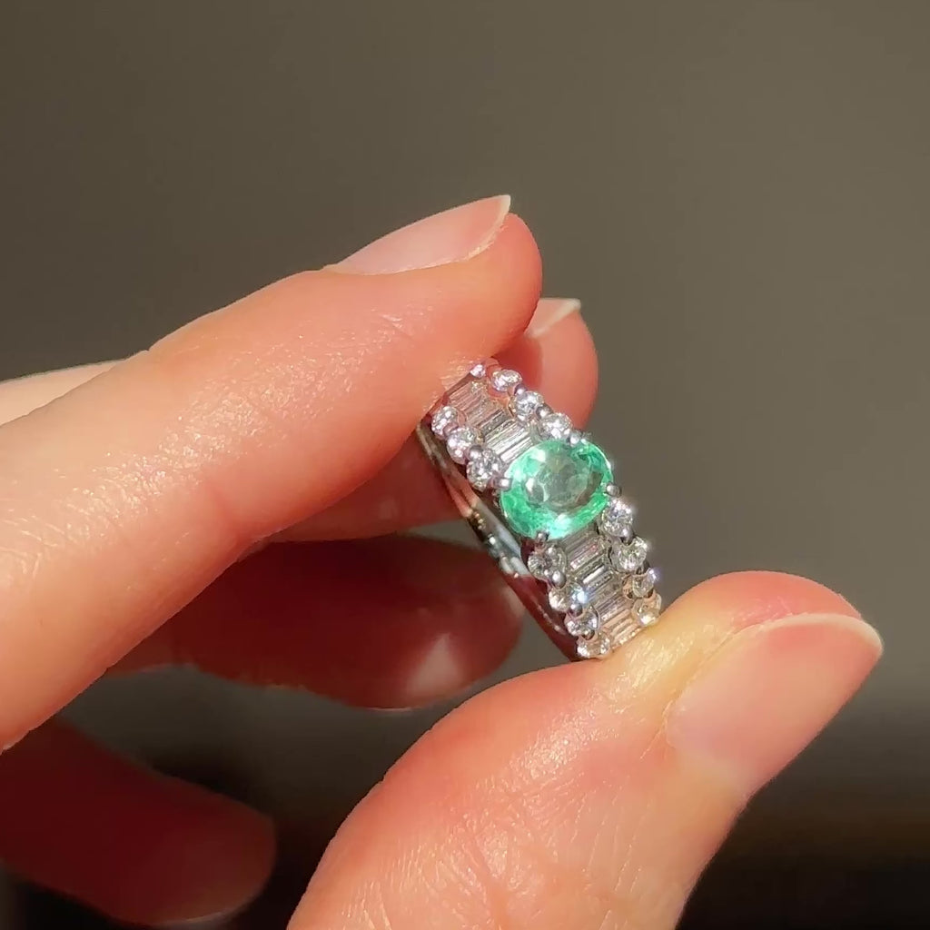 La tormalina, di taglio ovale e di 0.76ct, si trova a decorare una montatura in platino e a fascia, con una parte frontale che mantiene le stesse dimensioni, una caratteristica che non solo rende l’anello molto comodo da indossare ma che permette anche di riempire tutta questa sezione da altre pietre: a ogni lato della tormalina troviamo infatti tre file parallele di diamanti, con le due esterne di taglio brillante e con quella centrale di taglio baguette, arrivando insieme a un totale di 0.71ct.