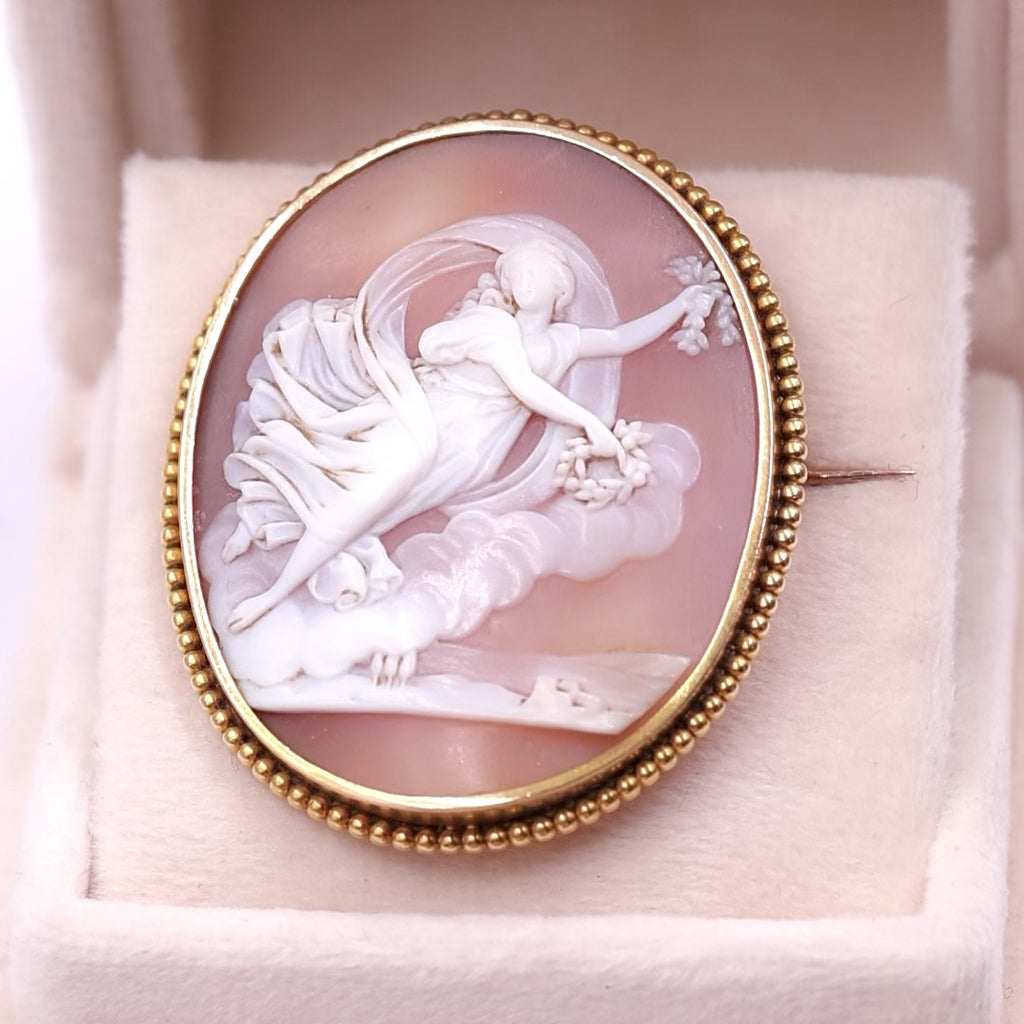 Oro giallo 14k, cammeo su conchglia raffigurante Flora ( dea della primavera )